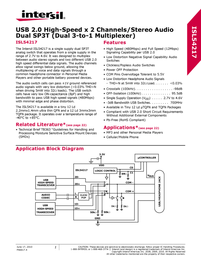 ISL54217 USB 2.0 High-Speed x 2Channels/Stereo Audio Dual SP3T (Dual 3 to 1 Multiple...