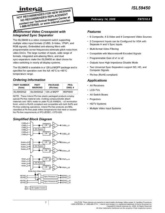 ISL59450 Multiformat Video Crosspoint with Integrated Sync Separator