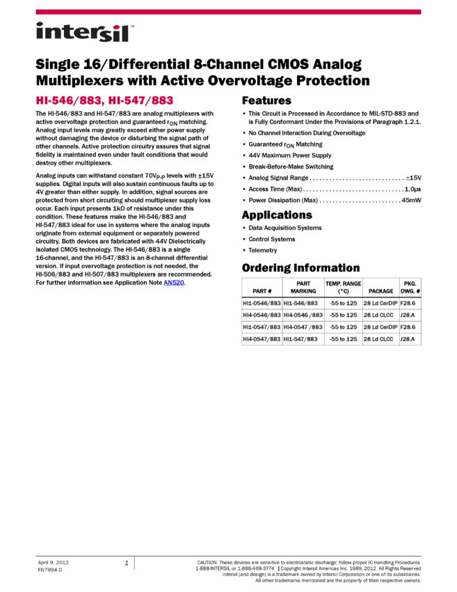HI-547/883 Single 16/Differential 8-Channel CMOS Analog Multiplexers with Active Overv...