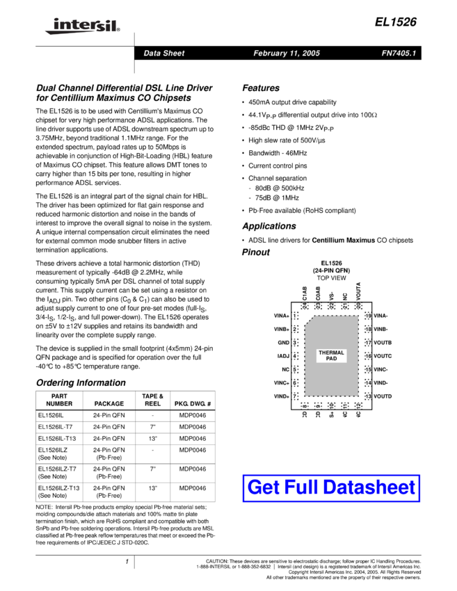 EL1526 Dual Channel Differential DSL Line Driver for Centillium Maximus CO Chipset...