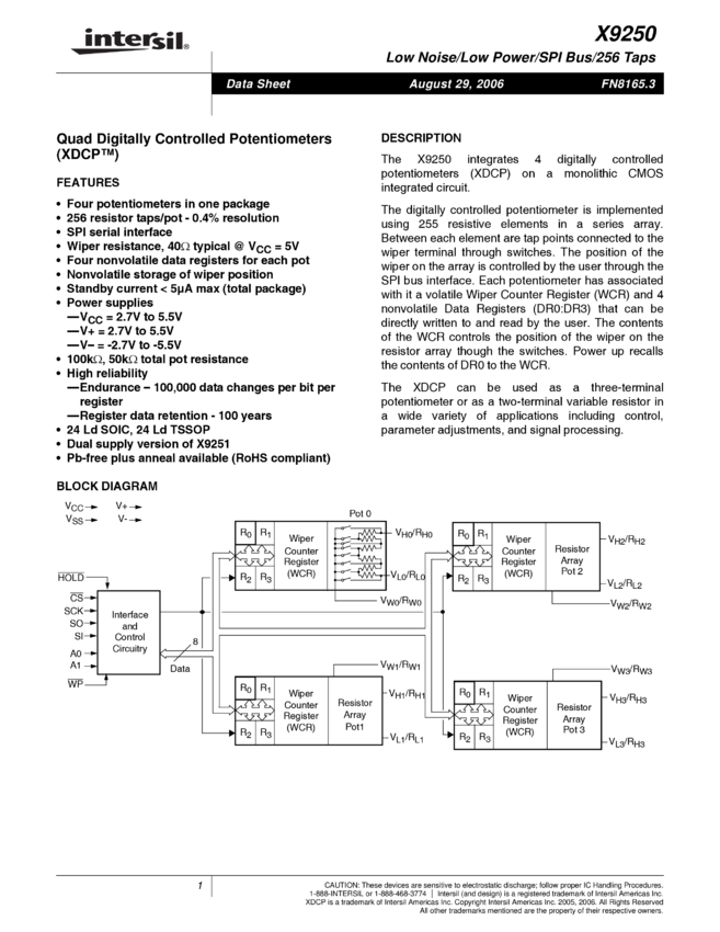 X9250 Quad Digitally Controlled Potentiometer (XDCP™)