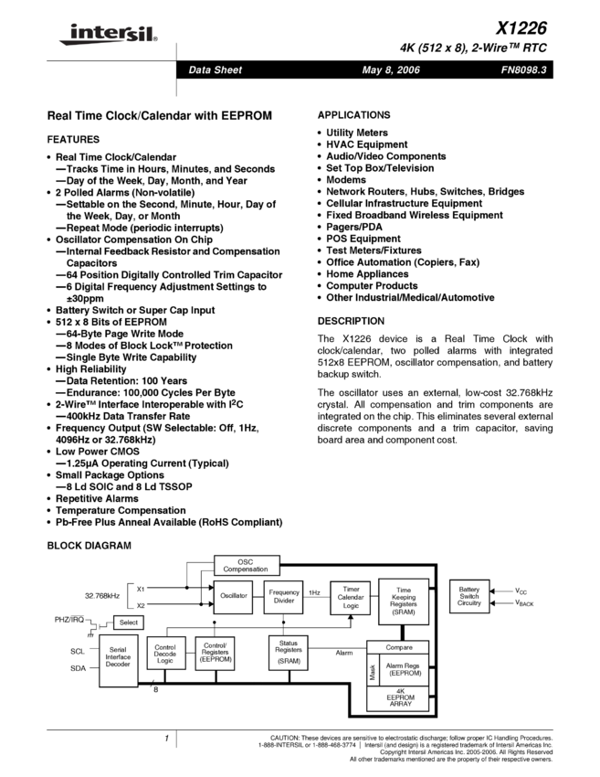 X1226 4k (512x8), 2-Wire™ RTC; Real Time Clock/Calendar with EEPROM