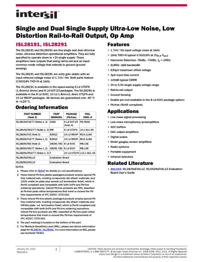 ISL28191 Dual Single Supply Ultra-Low Noise, Low Distortion Rail-to-Rail Output, Op...