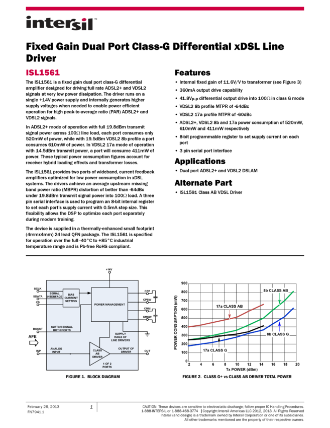 ISL1561 Fixed Gain Dual Port Class-G Differential xDSL Line Driver
