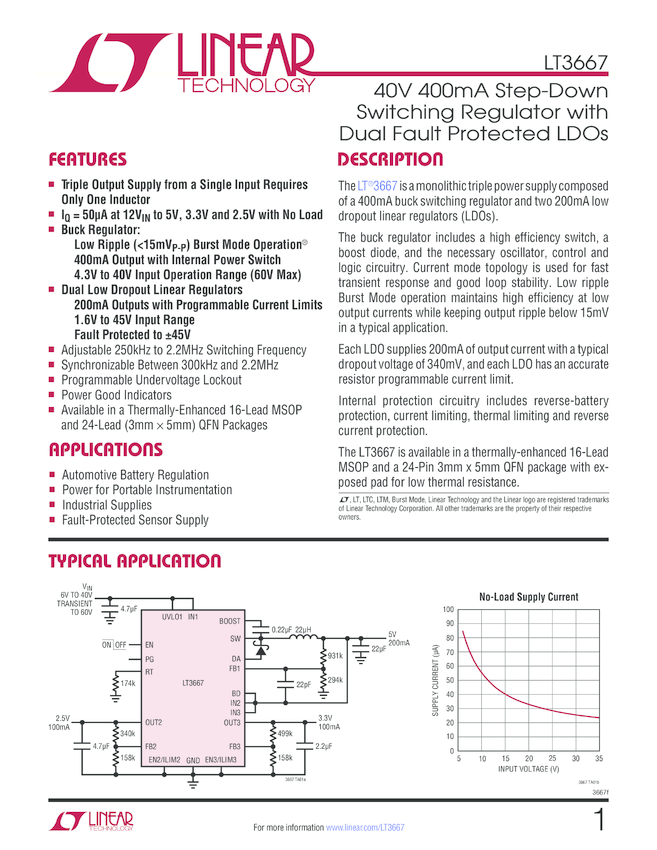 LT3667 40V 400mA Step-Down Switching Regulator with Dual Fault Protected LDOs