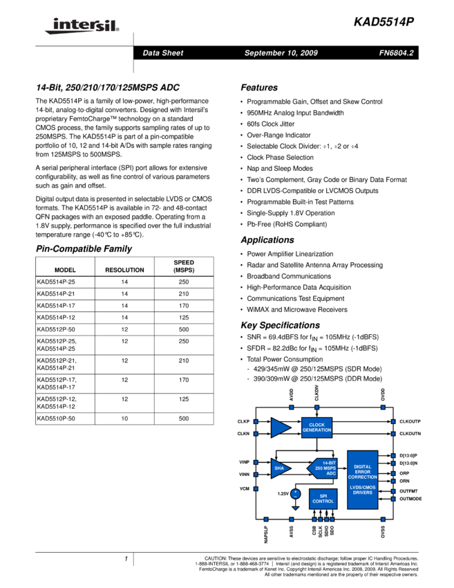 KAD5514P-25 14-Bit, 250MSPS Single-Channel ADC with LVDS/LVCMOS Outputs