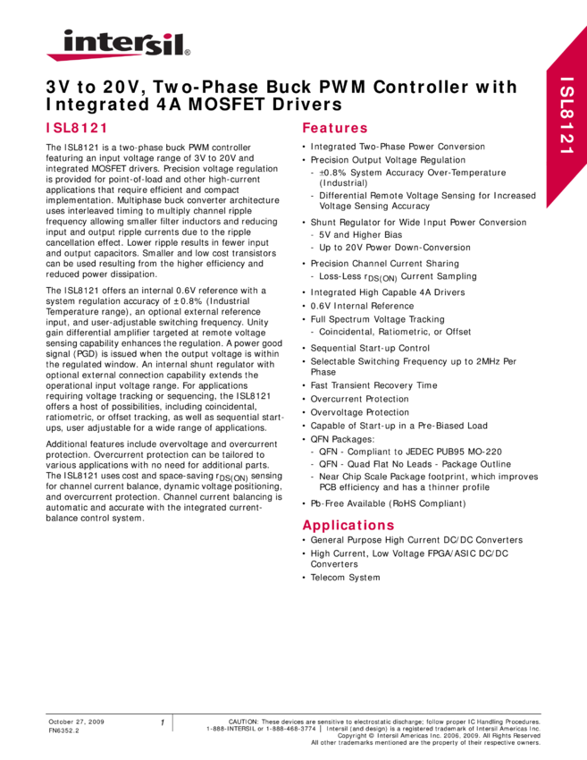 ISL8121 3V to 20V, Two-Phase Buck PWM Controller with Integrated 4A MOSFET Drivers
