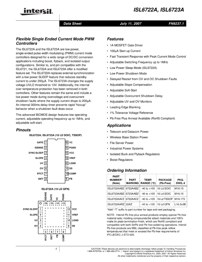 ISL6723A Flexible Single Ended Current Mode PWM Controllers