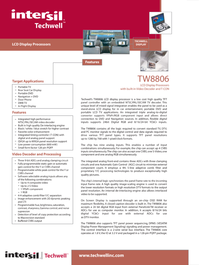 TW8806 LCD Display Processors with built-in Video Decoder and T-CON