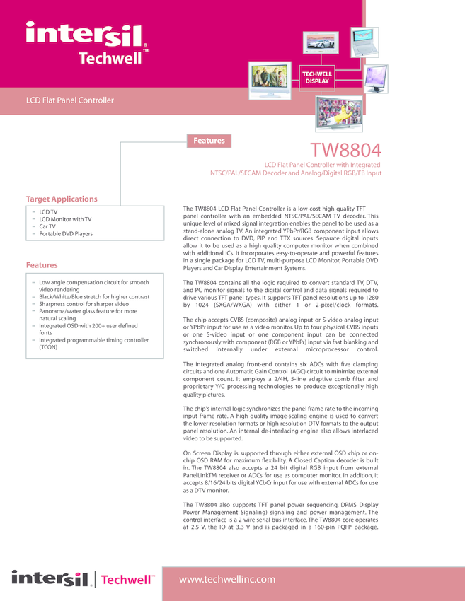 TW8804 LCD Flat Panel Controller with Integrated NTSC/PAL/SECAM Decoder and Analog...