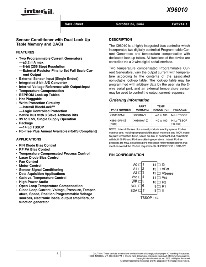 X96010 Sensor Conditioner with Dual Look Up Table Memory and DACs