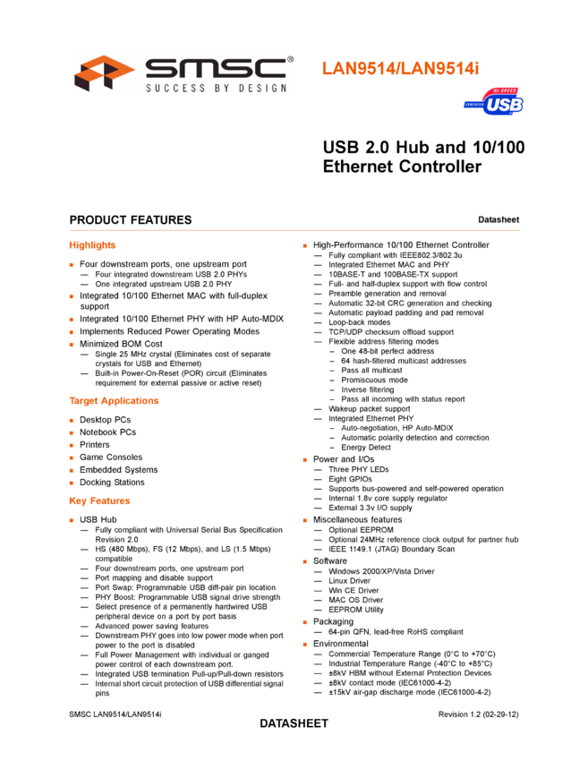 LAN9514/LAN9514i USB 2.0 Hub and 10/100 Ethernet Controller Data Sheet (02/29/2012)