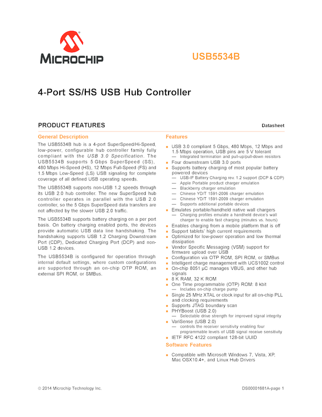 USB5534B 4-Port SS/HS USB Hub Controller Data Sheet (02/28/2014)