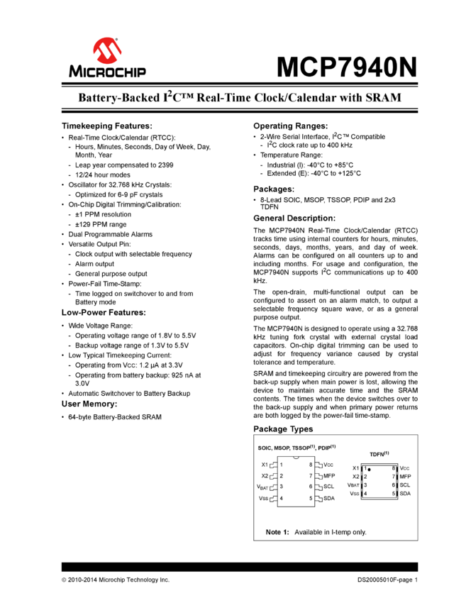 MCP7940N Low-Cost I2C Real-Time Clock/Calendar with SRAM and Battery Switchover (03/20/2014)