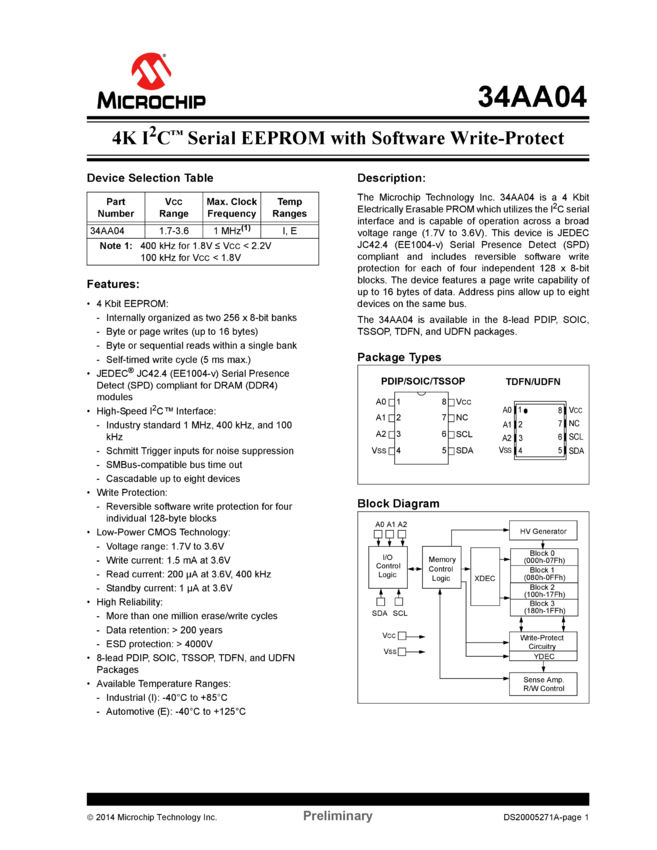 34AA04 4K I2C Serial EEPROM with Software Write-Protect Data Sheet (03/05/2014)