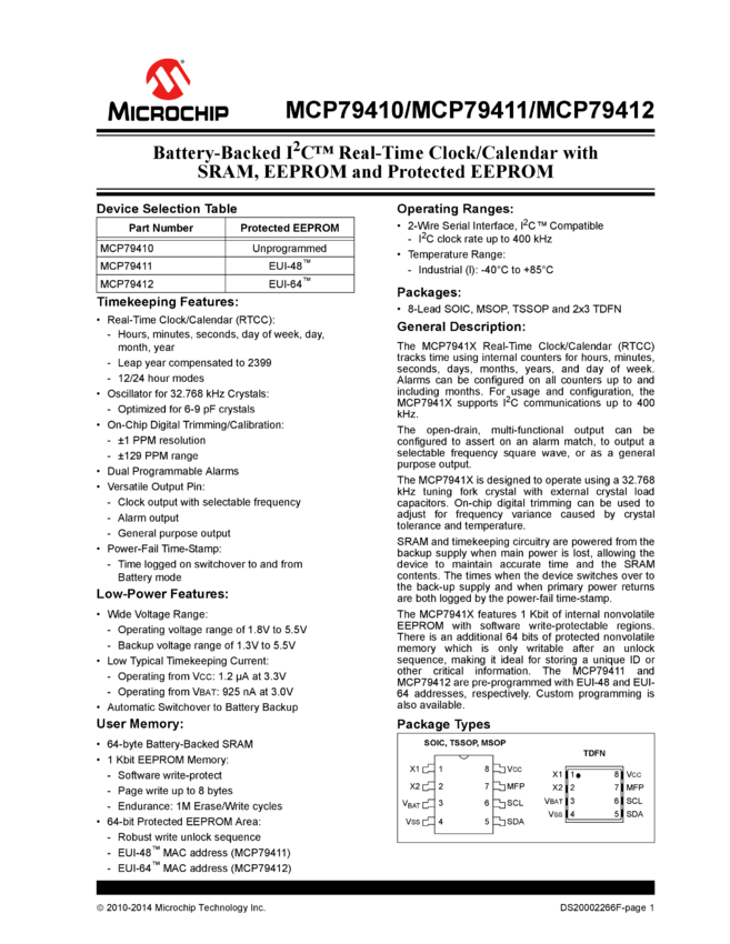 MCP79410/11/12 I2C Battery-Backed I2C RTCC w/SRAM, EEPROM and Protected EEPROM (03/31/2014)