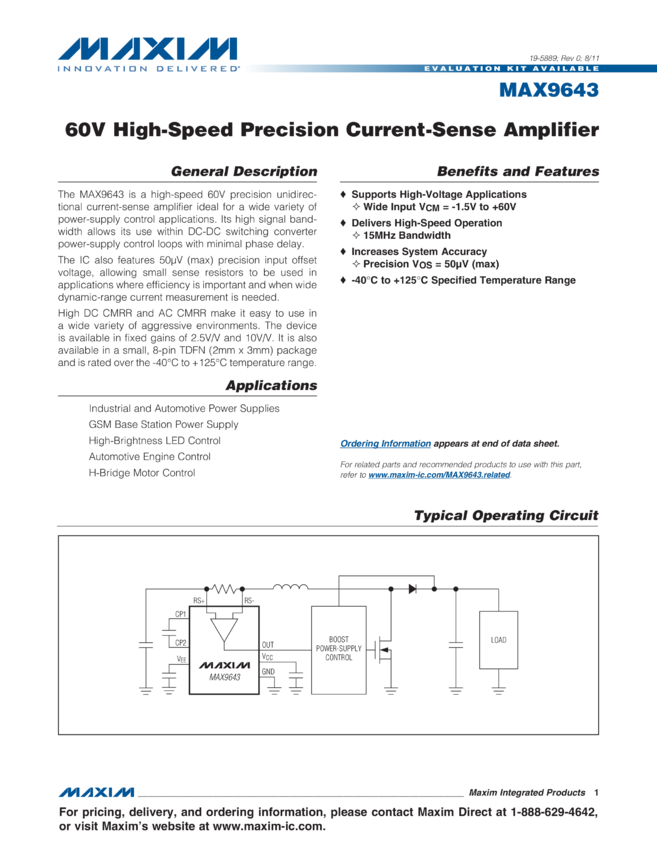 MAX9643 60V High-Speed Precision Current-Sense Amplifier