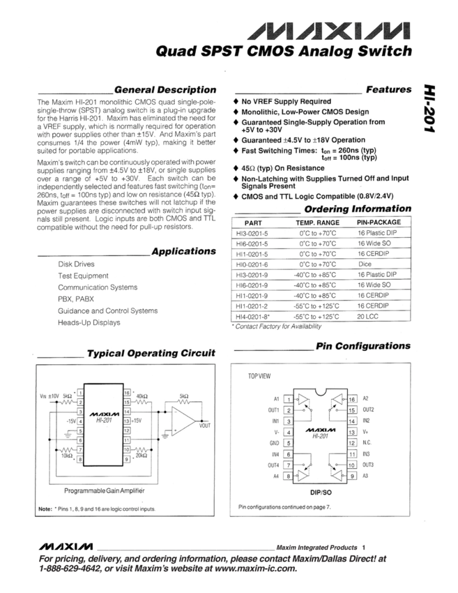 HI201 HI-201 Quad SPST, CMOS Analog Switch