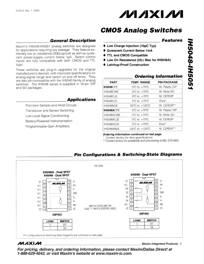 IH5048, IH5048A, IH5049, IH5050, IH5051 Dual SPST, Low Charge Injection Analog Switch