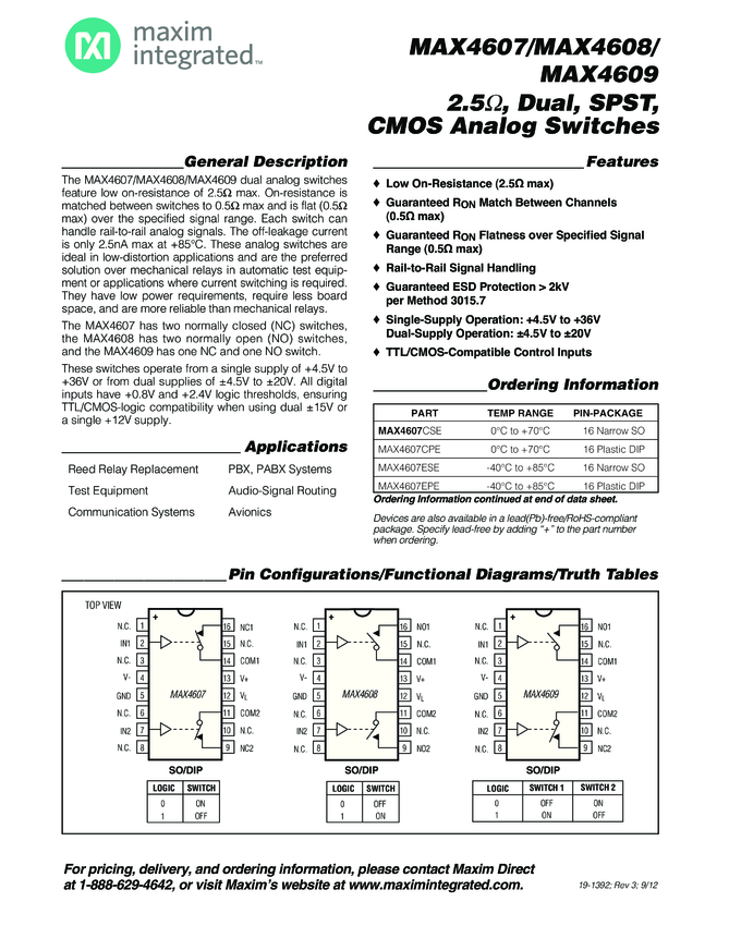MAX4607, MAX4608, MAX4609 2.5Ω, Dual, SPST, CMOS Analog Switches