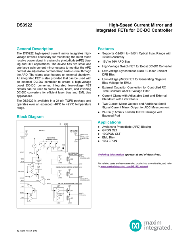 DS3922 High-Speed Current Mirror and Integrated FETs for DC-DC Controller
