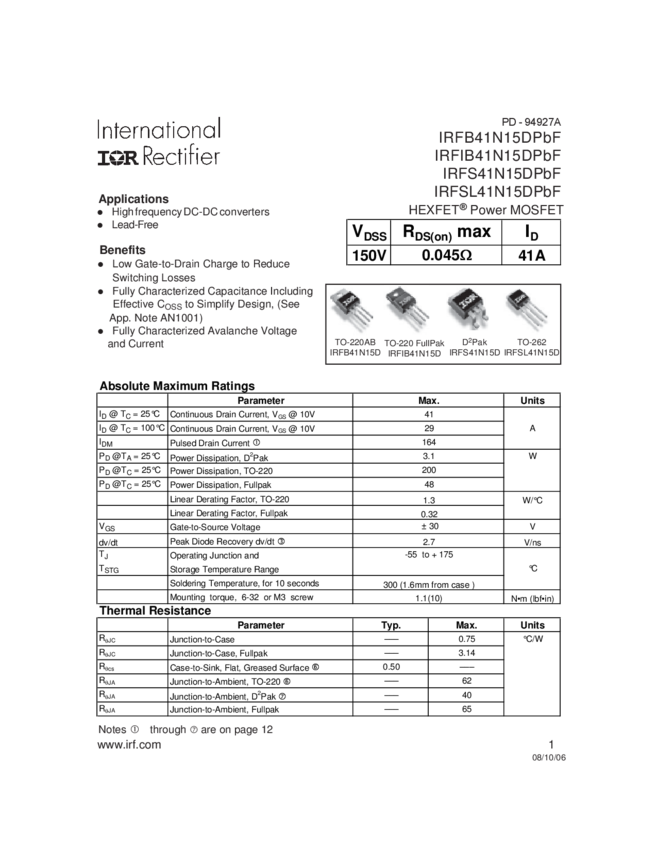 IRFS41N15D, IRFIB41N15D, IRFSL41N15D