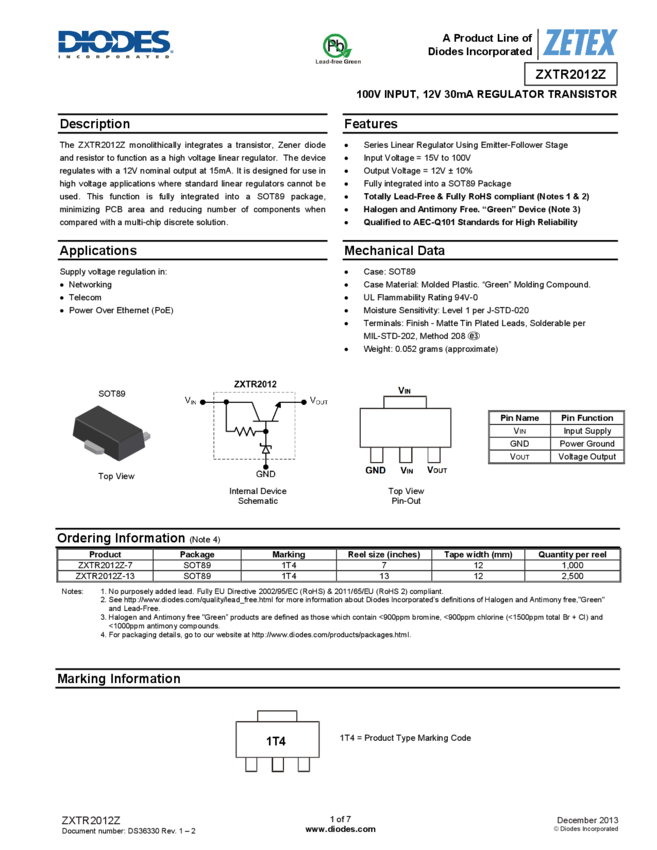 ZXTR2012Z 100V INPUT, 12V 30mA REGULATOR TRANSISTOR