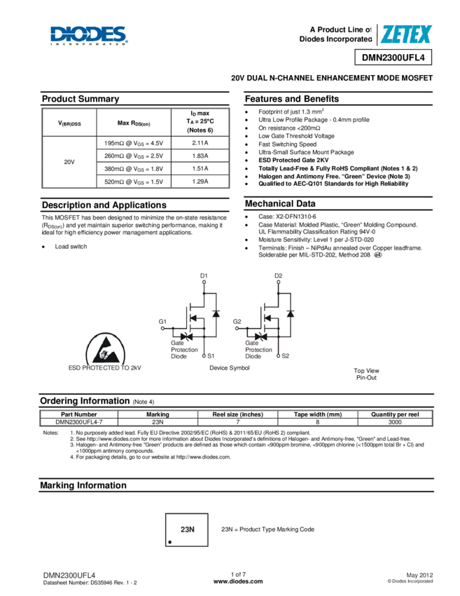 DMN2300UFL4 20V DUAL N-CHANNEL ENHANCEMENT MODE MOSFET