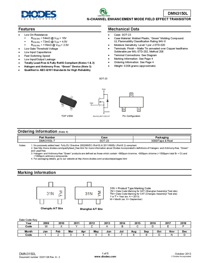 DMN3150L N-CHANNEL ENHANCEMENT MODE FIELD EFFECT TRANSISTOR