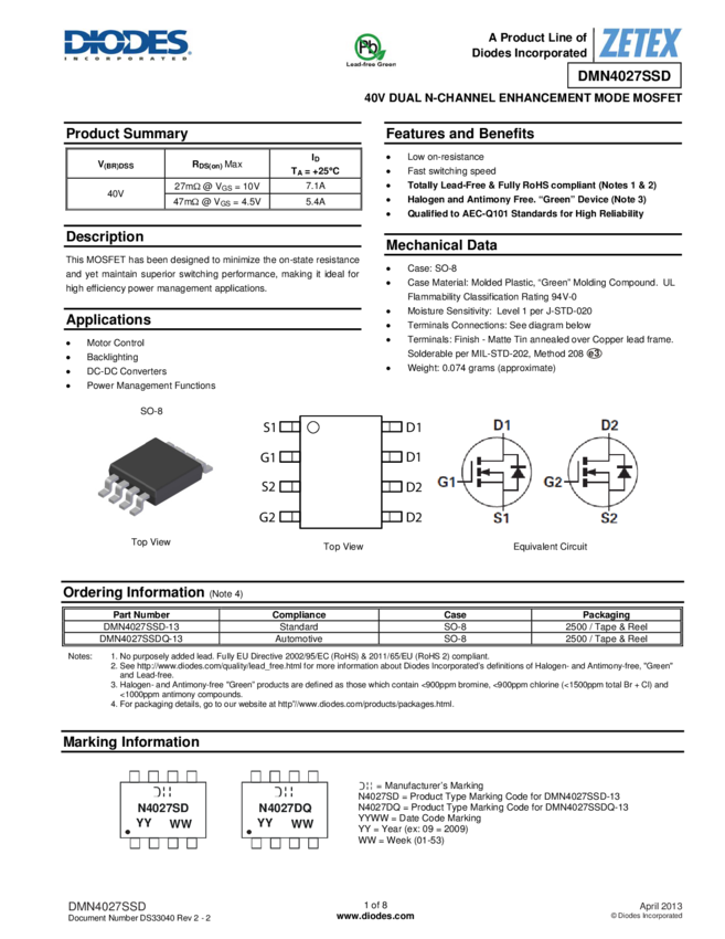DMN4027SSD 40V DUAL N-CHANNEL ENHANCEMENT MODE MOSFET