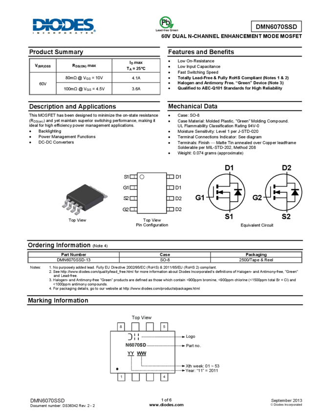 DMN6070SSD 60V DUAL N-CHANNEL ENHANCEMENT MODE MOSFET