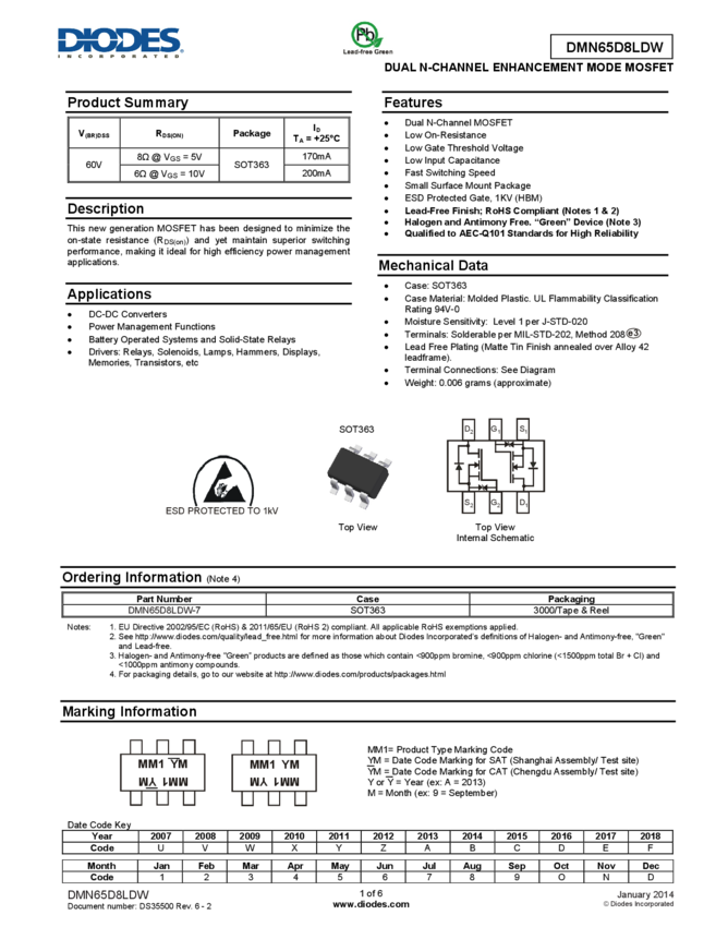DMN65D8LDW DUAL N-CHANNEL ENHANCEMENT MODE MOSFET