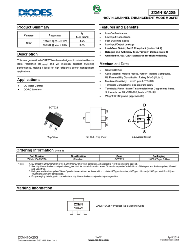 ZXMN10A25G 100V SOT223 N-CHANNEL ENHANCEMENT MODE MOSFET