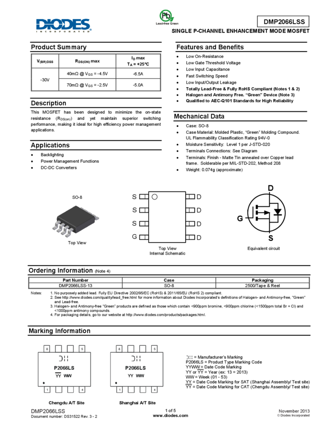 DMP2066LSS SINGLE P-CHANNEL ENHANCEMENT MODE MOSFET