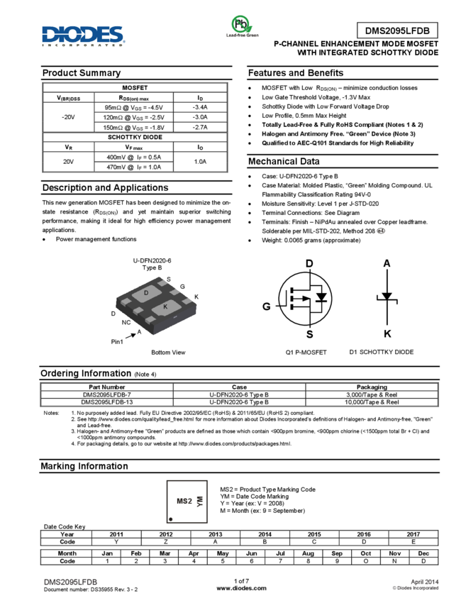DMS2095LFDB P-CHANNEL ENHANCEMENT MODE MOSFET WITH INTEGRATED SCHOTTKY DIODE