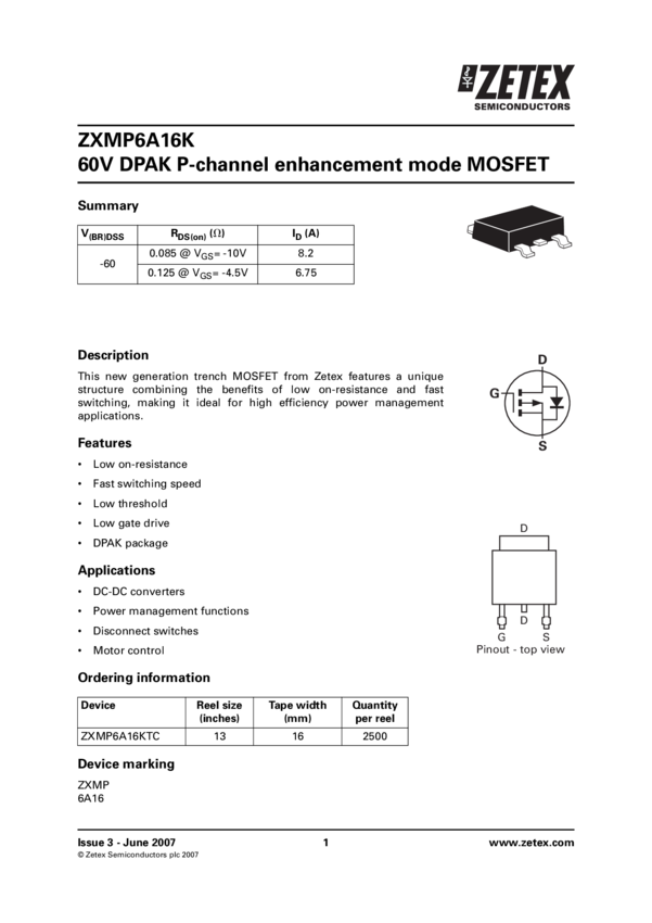 ZXMP6A16K 60V DPAK P-CHANNEL ENHANCEMENT MODE MOSFET