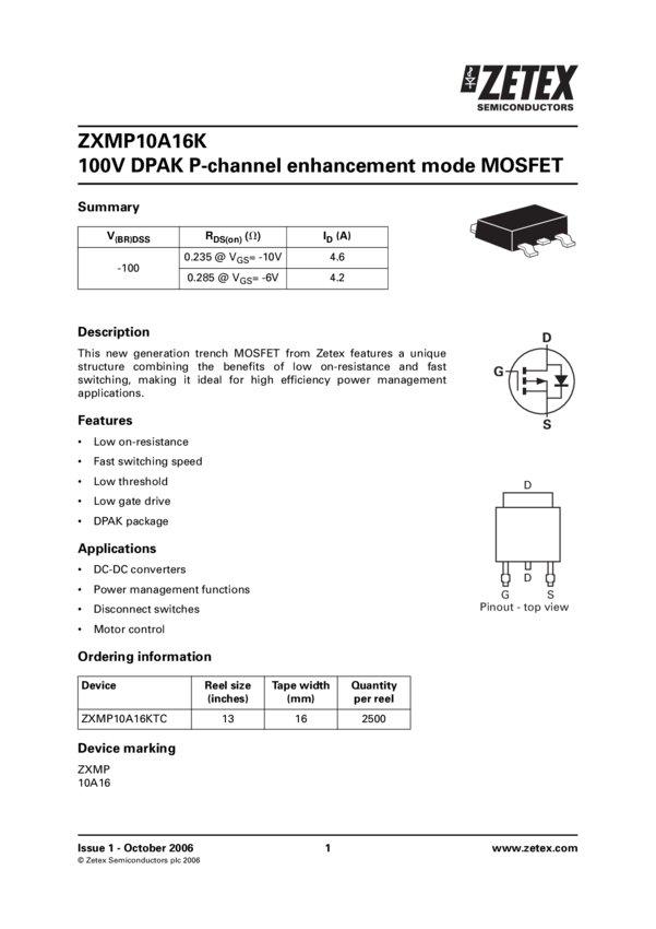 ZXMP10A16K 100V DPAK P-CHANNEL ENHANCEMENT MODE MOSFET