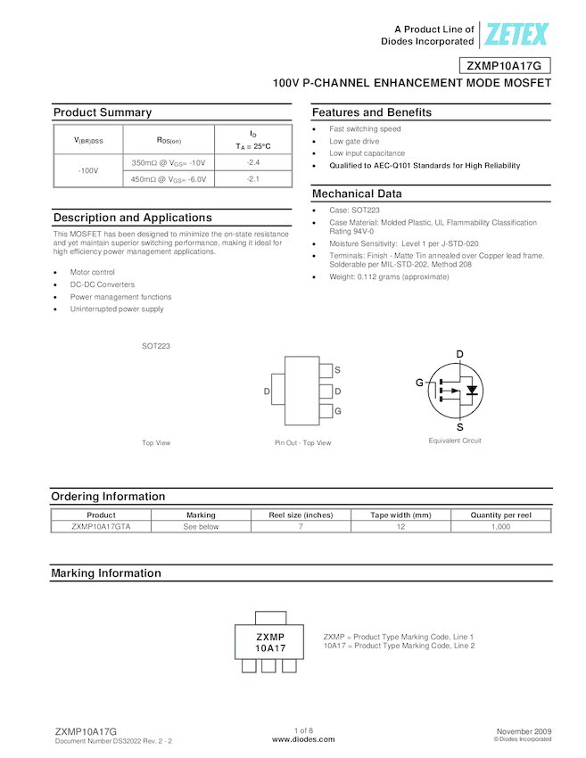 ZXMP10A17G 100V P-CHANNEL ENHANCEMENT MODE MOSFET