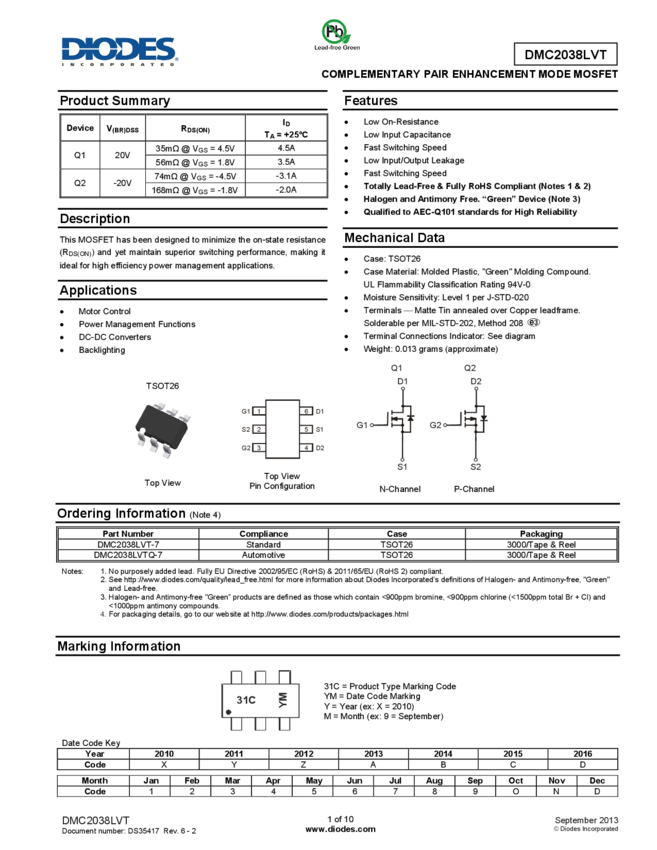 DMC2038LVT COMPLEMENTARY PAIR ENHANCEMENT MODE MOSFET
