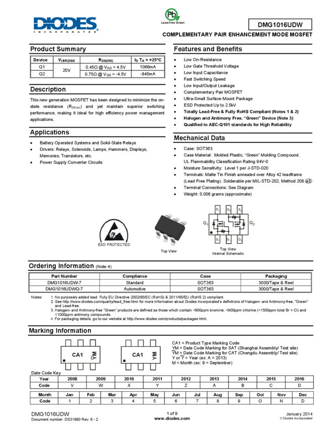 DMG1016UDW COMPLEMENTARY PAIR ENHANCEMENT MODE MOSFET