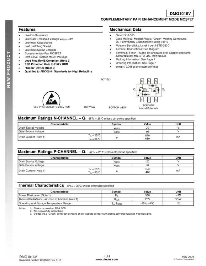 DMG1016V COMPLEMENTARY PAIR ENHANCEMENT MODE MOSFET