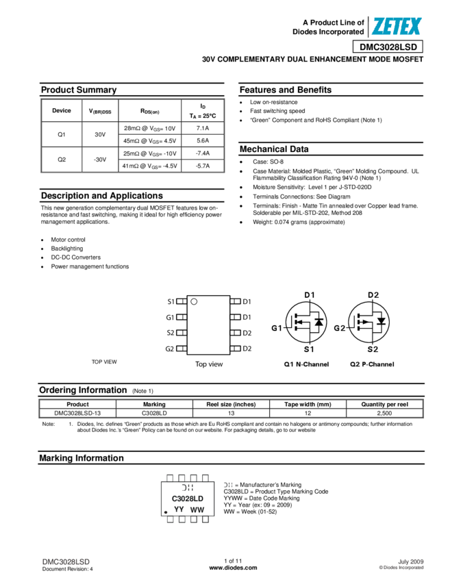 DMC3028LSD 30V COMPLEMENTARY DUAL ENHANCEMENT MODE MOSFET