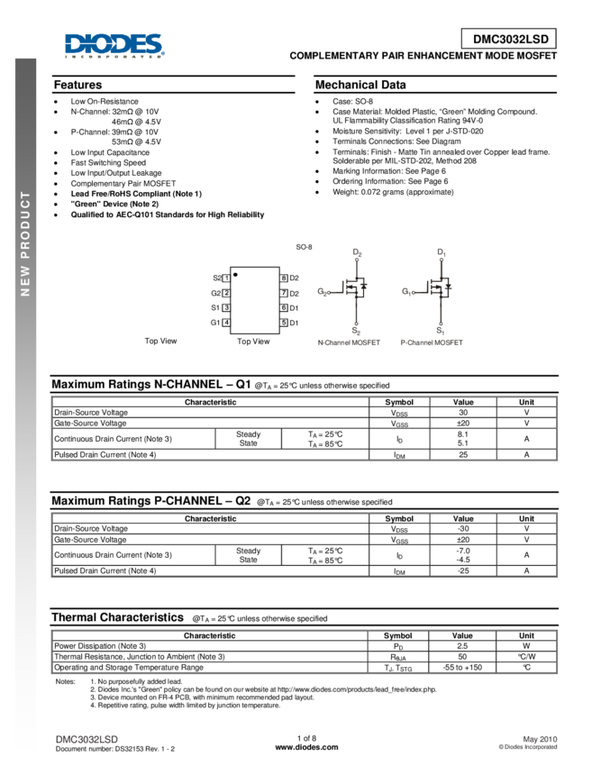 DMC3032LSD COMPLEMENTARY PAIR ENHANCEMENT MODE MOSFET