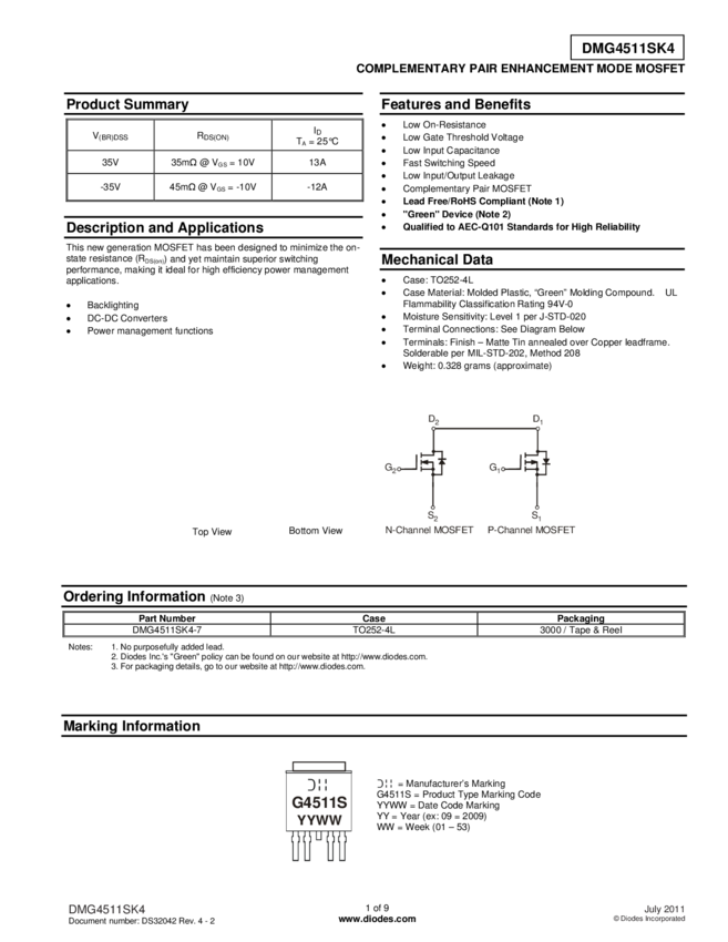 DMG4511SK4 COMPLEMENTARY PAIR ENHANCEMENT MODE MOSFET