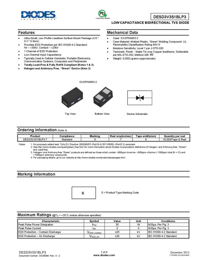 DESD3V3S1BLP3 LOW CAPACITANCE BIDIRECTIONAL TVS DIODE