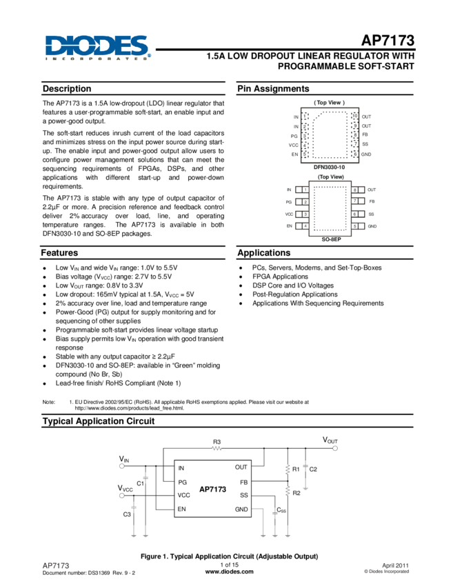 AP7173 1.5A Low Dropout Linear Regulator with Programmable Soft-Start