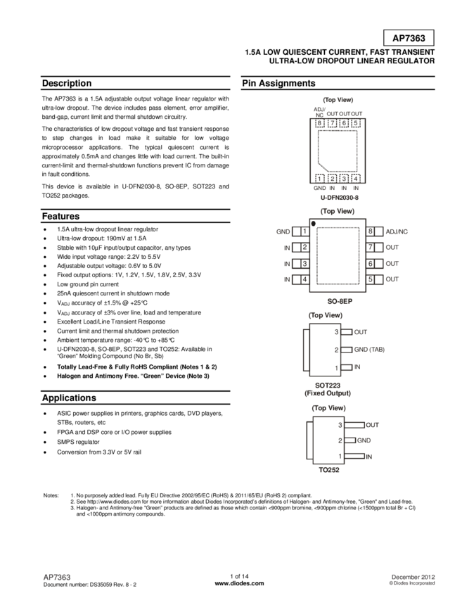 AP7363 1.5A, Low Quiescent Current, Fast Transient Ultra-Low Dropout Linear Regula...