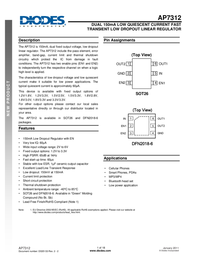 AP7312 DUAL 150mA LOW QUIESCENT CURRENT FAST TRANSIENT LOW DROPOUT LINEAR REGULATO...