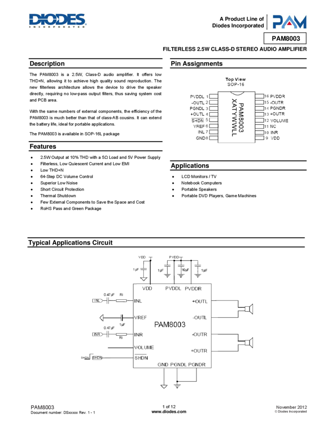 PAM8003 2.5W STEREO FILTERLESS CLASS-D AUDIO AMPLIFIERWITH DC VOLUME CONTROL