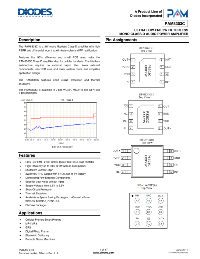 PAM8303C ULTRA LOW EMI 3W MONO FILTERLESS CLASS-D AUDIO AMPLIFIER